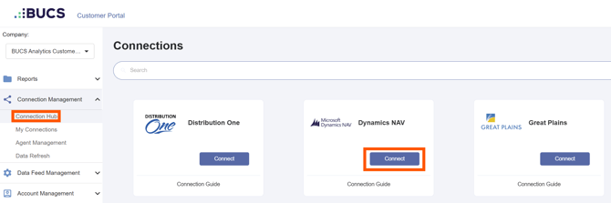 Go to BUCS Customer Portal > Connection Management > Connection Hub. Locate or search for the Dynamics NAV connector and click Connect.