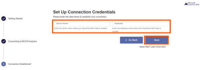 Provide your database server Username and Password and the Server Name and Database Name where the Dynamics NAV data is located. Click Save.