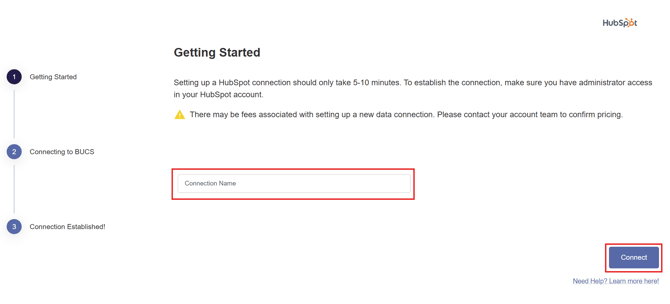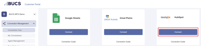 Go to BUCS Customer Portal > Connection Hub. Locate or search for the HubSpot connector and click Connect.