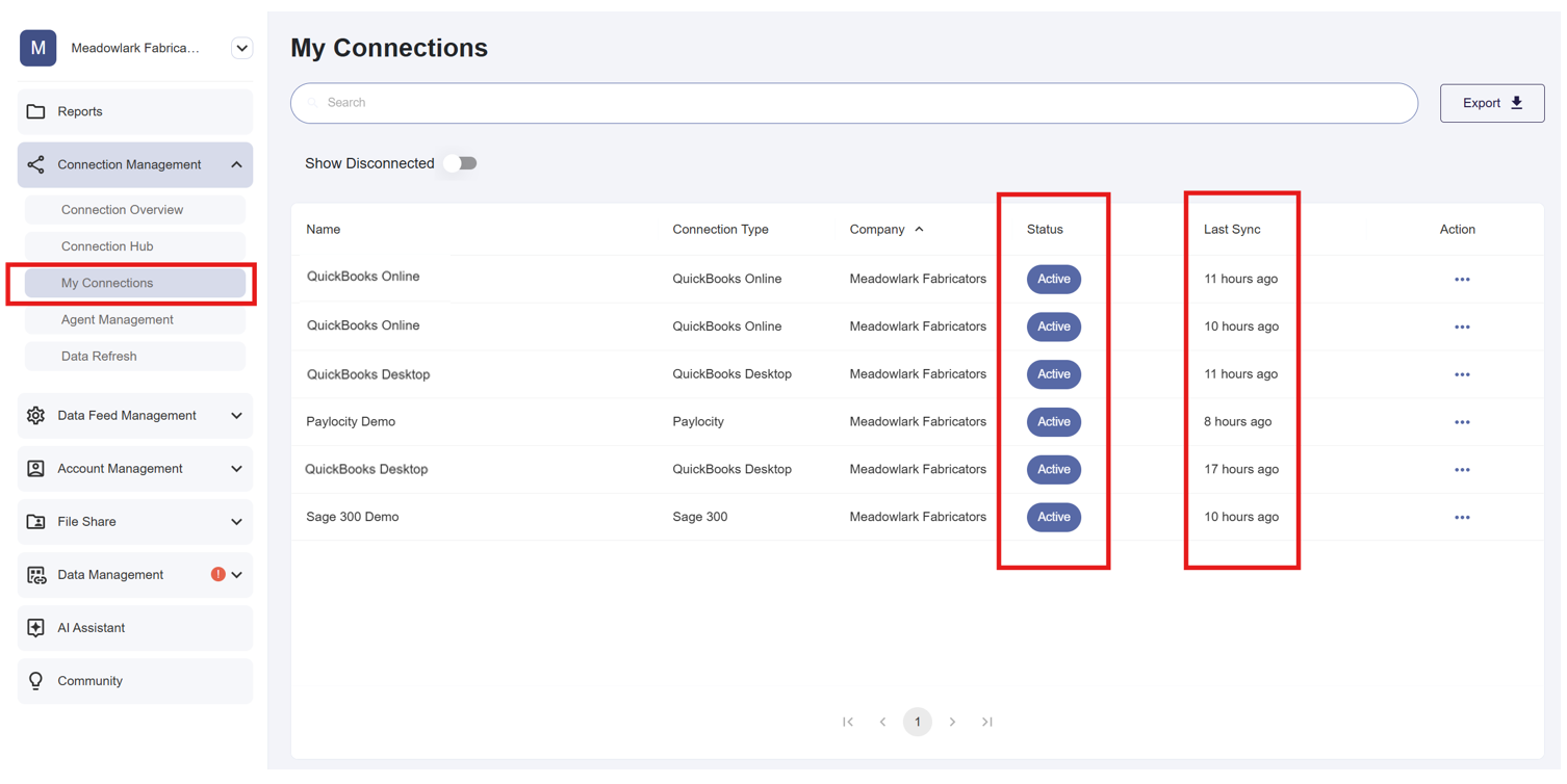 Log in to your BUCS account. Click on Customer Portal > Connection Management > My Connections. You will see a list of all the connections created for the companies you have access to within the BUCS platform. You can review connection status and view when the connection data was last synced/refreshed.
