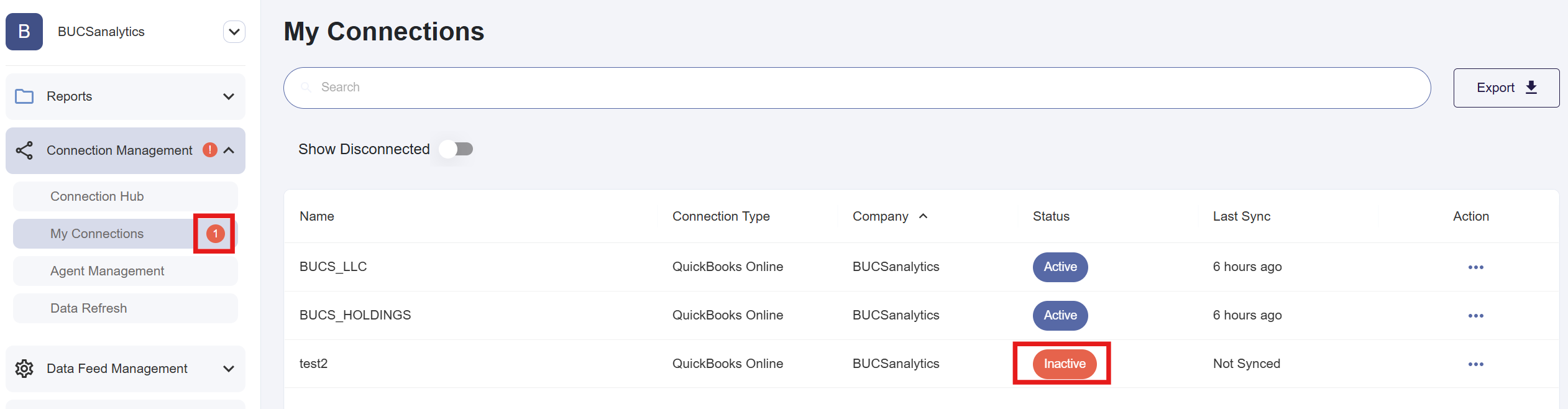⚠️ Re-establishing a connection: If a connection has become Inactive, a notification bubble on the My Connections menu will alert of this change. The connection can be re-established by clicking the Action menu for the connection and selecting Reconnect. If the connection is no longer needed, select Disconnect.
