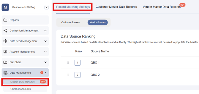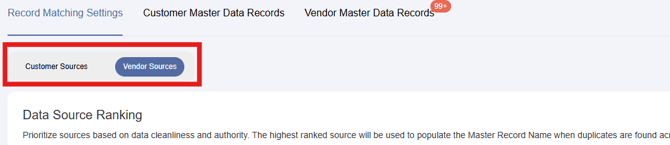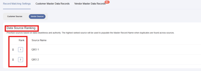 Rank your data sources in order of most accurate customer/vendor names to least accurate customer/vendor names. This ranking is taken into account when determining which record should be the master record name when duplicate/similar records are found.