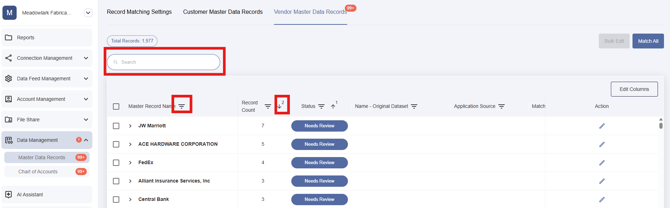 - Review the records presented. You can search for a specific customer or vendor, filter the table to a subset of records or sort. The table is sorted ascending by Record Count so you can review the largest companies/vendors first.