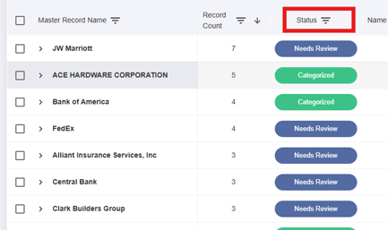 - The Status column will show whether the record Needs Review or has already been Categorized.