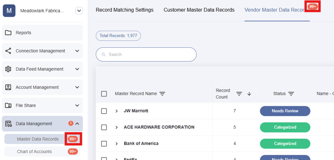 ℹ️ The red notification badge on the navigation menu and Customer and Vendor tabs displays how many records are left to review.