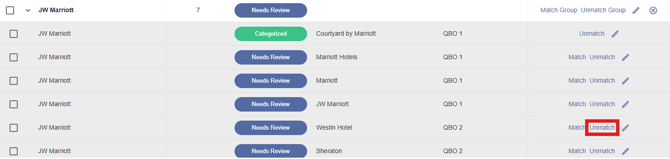 - If there are some records within the group that should not be classified in that Master Record group, click the Unmatch button on the individual record to remove from the group. The individual record will then become it's own master record with the name from the original dataset listed as the Master Record Name.