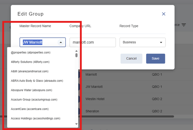 - The Edit Group modal will appear. Use the Master Record Name drop down to select an existing Master Record Name or add a new Master Record Name.