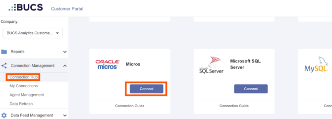 Go to BUCS Customer Portal > Connection Management > Connection Hub. Locate or search for the Micros connector and click Connect..