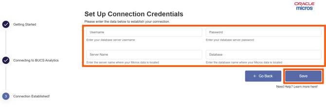 Provide your database server Username and Password and the Server Name and Database where your Micros data is located. Click Save.