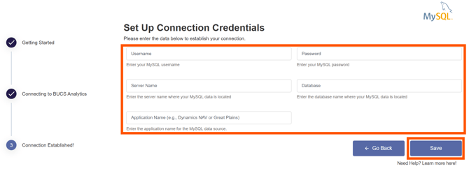 If the connection was established successfully, you will see a Connection Established message and data from your MySQL data source will continuously sync to BUCS. If the connection was not successful, you will be asked to try again.