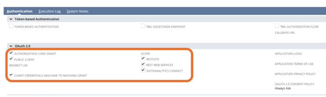 3. Under the Authentication tab, make sure AUTHORIZATION CODE GRANT, PUBLIC CLIENT, CLIENT CREDNETIALS (MACHINE TO MACHINE) GRANT, RESTLETS, REST WEB SERVICES, SUITEANALYTICS CONNECT are all checked.