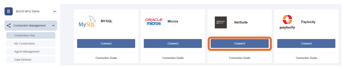 1. Go to BUCS Customer Portal > Connection Management > Connection Hub. Locate or search for the NetSuite connector and click Connect.
