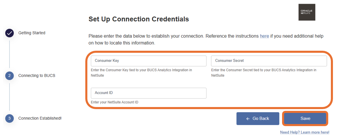 3. Provide the Consumer Key and Consumer Secret values you retained from previous setup steps and provide your NetSuite Account ID. Click Save