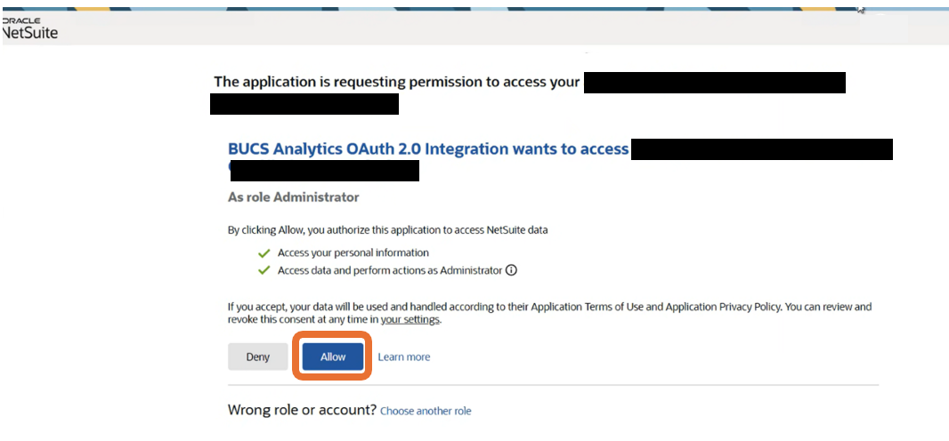 4. You will be redirected to NetSuite to grant BUCS access to your NetSuite data. Click Allow.