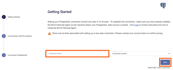 To establish the data connection, you will need the BUCS Remote Agent installed on the machine where your PostgreSQL data is located. Remote Agent installation instructions can be accessed here.