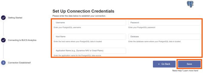 If the connection was established successfully, you will see a Connection Established message and data from your PostgreSQL data source will continuously sync to BUCS. If the connection was not successful, you will be asked to try again.