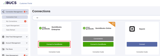 Go to BUCS Customer Portal > Connection Management > Connection Hub. Locate or search for the QuickBooks Enterprise connector and click Connect.