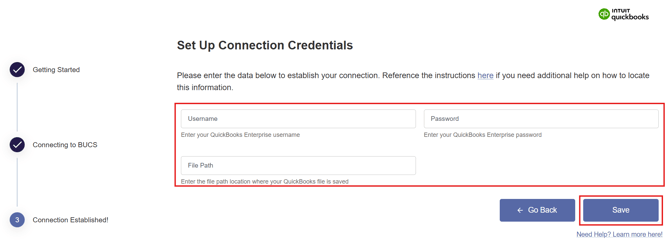 Provide the File Path to the QuickBooks Enterprise data file and your QuickBooks Enterprise Username and Password. Click Save. The Username and Password can be associated to an existing user or you can setup a new dedicated BUCS user in your QuickBooks Enterprise account.