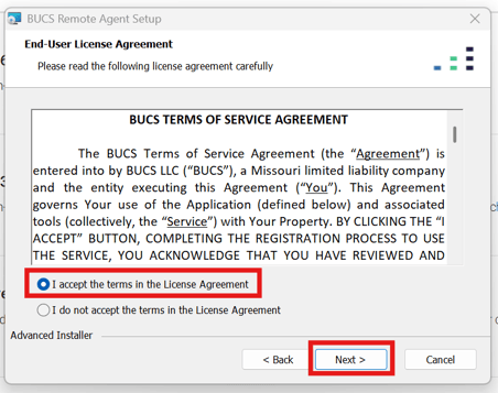 The installer will update the existing BUCS Remote Agent to the latest version.