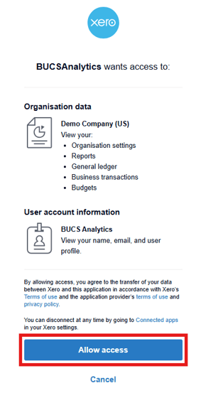 NOTE: If you don't see your Xero data appear in the BUCS platform in 24 hours, please contact your account team.